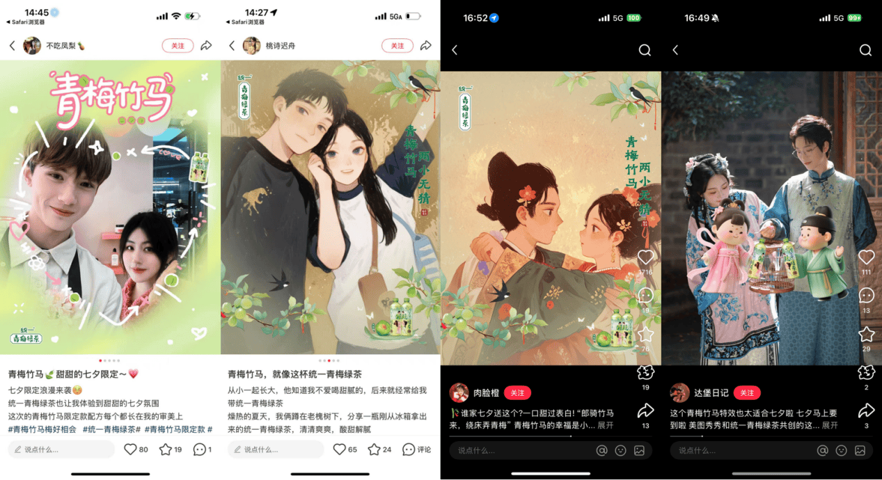 这种国风底蕴+创意互动的玩法,既满足了年轻用户对国风内容的美学需求,又让「青梅竹马」的品牌主题从静态认知升级为动态体验。用户生成的唐风CP照不仅个性十足,更成为社交平台的吸睛利器,“和对象的唐风青梅竹马照太绝了,不愧是我最爱的统一青梅绿茶”“美图这个特效直接把七夕氛围感拉满,好喜欢,配青梅绿茶刚刚好”等用户真实反馈内容刷屏社交圈,吸引大量用户跟风创作,进一步扩大项目传播范围。