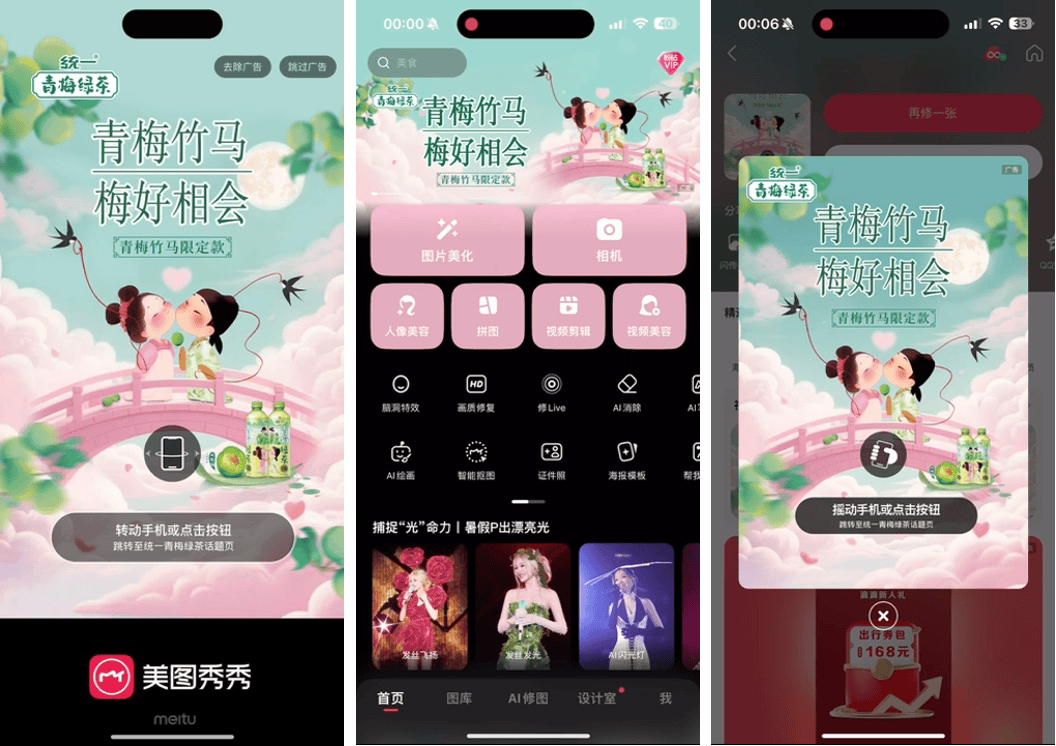 为了让「青梅竹马」的浪漫触达更多人,统一青梅绿茶与美图秀秀打出了硬广+软性运营的组合拳,打通“曝光-互动-留存”的全链路,实现营销效果最大化。
