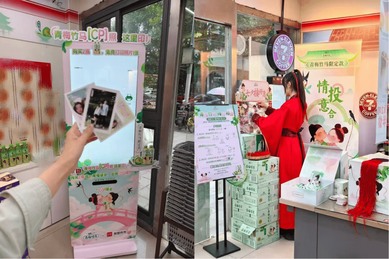 线上的浪漫再热闹,也需要线下的触点来夯实记忆。在8月27日-29日七夕热度高峰时段,美图与统一青梅绿茶把“青梅竹马 梅好相会”的主题快闪,开进了7-ELEVEN线下门店,以便利店的温馨场景为依托,融合“好拍、好玩、好礼”,成为七夕期间周边消费者的必打卡地。