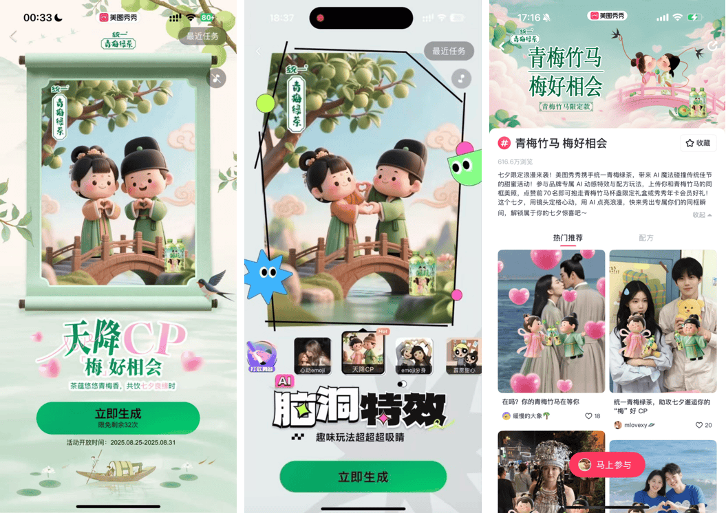 年轻人的七夕,本质是“找个理由好好表达爱”,但传统的秀恩爱方式早已缺乏新鲜感。而作为中国梅子茶、中国青梅食饮文化的传播者,统一青梅绿茶与美图秀秀精准抓住这一痛点,将品牌营销中核心的「青梅竹马」概念,与美图秀秀的影像技术深度绑定,打造出两大低门槛、强创意的线上玩法,让用户在创作中感知品牌温度,在分享中扩散品牌声量。
